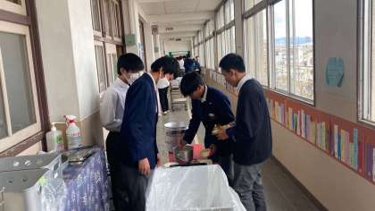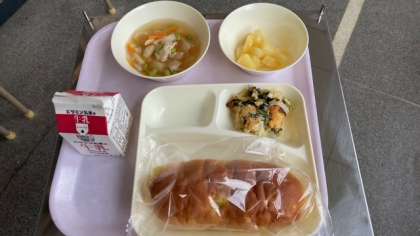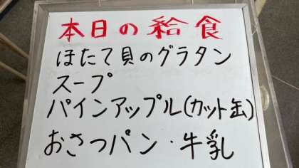 今日の給食は、ホタテ貝のグラタン、スープ、パインアップル(カット缶)です。パンはおさつパンです。