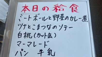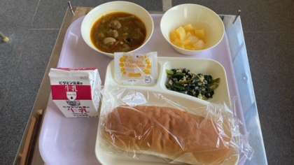 今日の給食は、ミートボールと野菜のカレー煮、ツナと小松菜のソテー、白桃(カット缶)です。