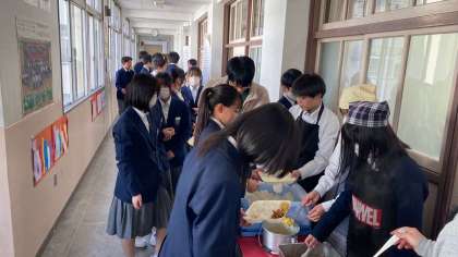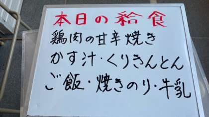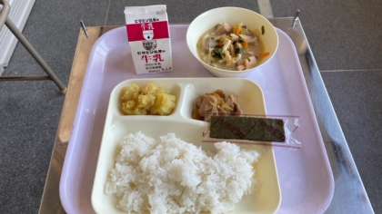 今日の給食は、鶏肉の甘辛焼き、かす汁、栗きんとん、焼き海苔です。