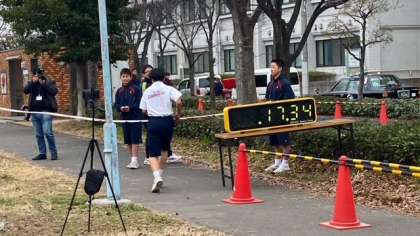 1年生女子の1位、2位、3位がゴールしました。よく頑張りました。次々とゴールしていきます。