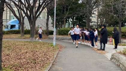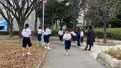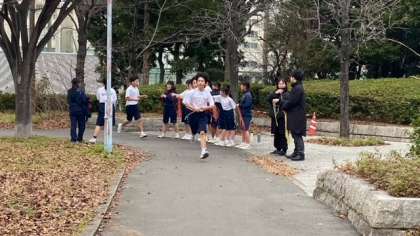 女子の係生徒からタスキを受け取り、3周目に入ります。後1周、勝負だ!