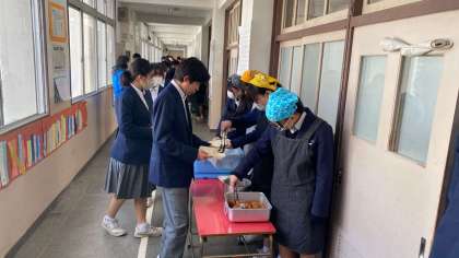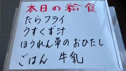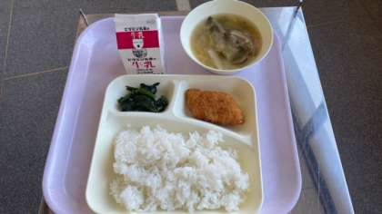 今日の給食は、鱈フライ、うすくず汁、ほうれん草のおひたしです。