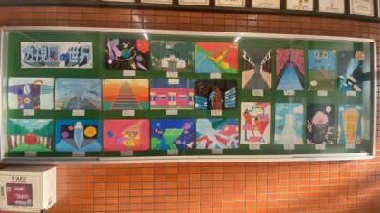 玄関内の掲示板には、美術科の作品が掲示されています。