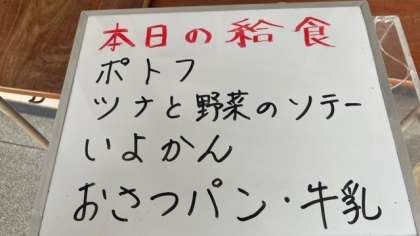 今日の給食は、ポトフ、ツナと野菜のソテー、いよかんです。パンはおさつパンです。