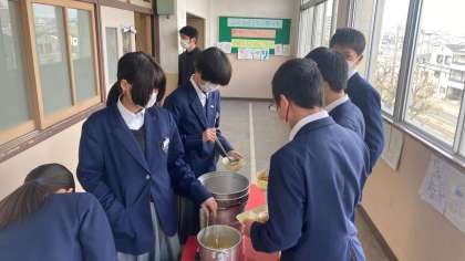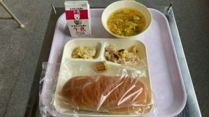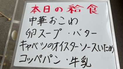 今日の給食は、中華おこわ、卵スープ、キャベツのオイスターソース炒めです。パンにはバターが付いています。