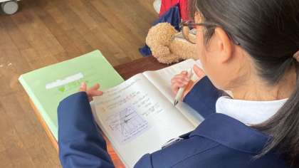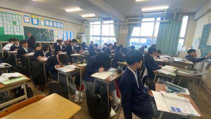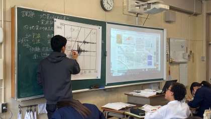 地震の伝わり方について学んでいます。震源地からの距離と地震が起こる時間の関係について、グラフから読み取り考察します。