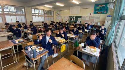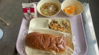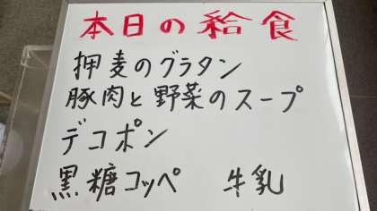 今日の給食は、押し麦のグラタン、豚肉と野菜のスープ、デコポンです。パンは黒糖パンです。
