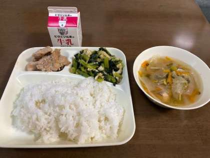 今日の給食は、鶏肉のなにわ甘辛ソースかけ、船場汁、小松菜の炊いたんです。
