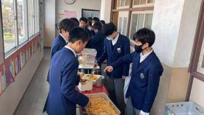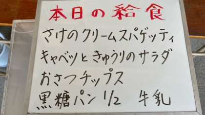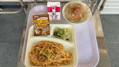 今日の給食は、鮭のクリームスパゲティー、キャベツときゅうりのサラダ、おさつチップスです。パンは2分の1の大きさのパンです。