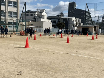 ドリブルのリレーを競っています。負けたら、腕立て伏せやバービーの補強運動が待ち受けています(涙)