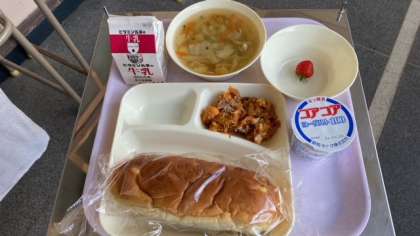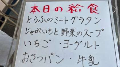 今日の給食は、豆腐のミートグラタン、じゃがいもと野菜のスープ、いちご、ヨーグルトです。パンはおさつパンです。いちごは天候不順のため、収穫量が少なく1人1個となってしまいました。