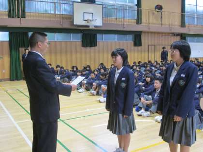 さて、只今、生徒会役員並びに学級委員の認証式を行いました。新旧のバトンタッチです。前期の執行部、クラスの委員の皆さん、半年間ご苦労様でした。そして、これからの新しい執行部の皆さんは、みんなの先頭に立って努力してもらいます。北中愛を出して、頑張ってください。