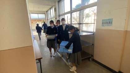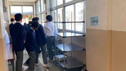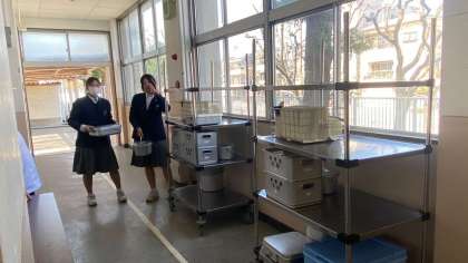 1年生も重たいご飯を1人で運んでいきます。階段でひっくり返らないように!