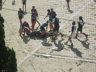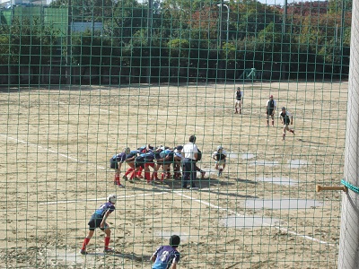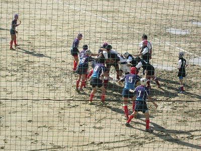 走りにくい悪コンディションの中、ラグビーの試合が行われています。