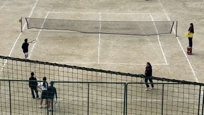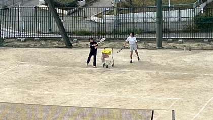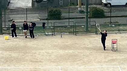 ソフトテニス部がリターン?と言うのか、打ち返しています。パシーンといい音が響いています。