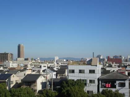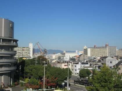 大阪ドーム、北摂の山々、大型クレーン、六甲連山がくっきりと見えています。