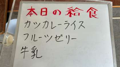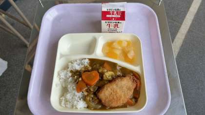 今日の給食は、カツカレーライス、フルーツゼリーです。