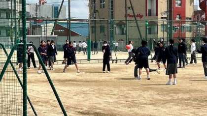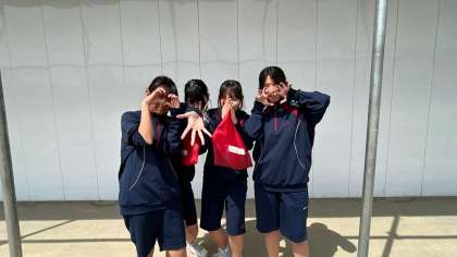 バレーボールをしている学年もあります。ホームページ上の写真を撮っていると、ある女子生徒から声をかけられました。「はい、ポーズ」