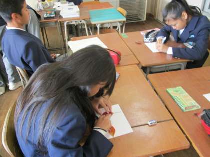 秋ならでは色合いの作品。色鉛筆を使って紅葉に挑戦します。