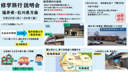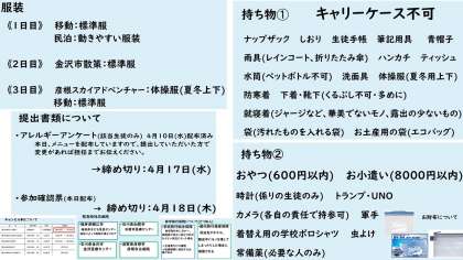 ★リュック…バス移動、金沢市散策などで、しおりや水筒などを入れるために使います。制カバンで大丈夫ですので、新たにご購入いただく必要はありません。