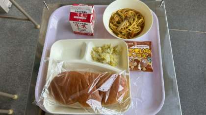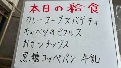 今日の給食は、カレースープスパゲティー、キャベツのピクルス、おさつチップスです。パンは黒糖パンです。