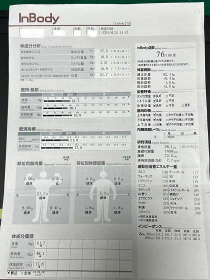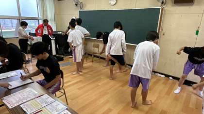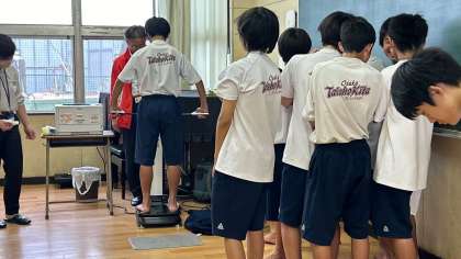 運動部の子どもたちが個々に測定し、筋肉量、体脂肪量などを測定。体成分の評価をもとに点数がつけられます。80点以上が目標です。測量に参加した生徒の皆さん、何点でしたか?