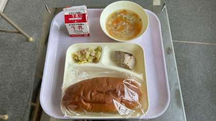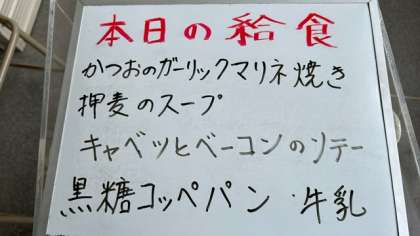 今日の給食は、かつおのガーリックマリネ焼き、押し麦のスープ、キャベツとベーコンのソテーです。パンは黒糖パンです。
