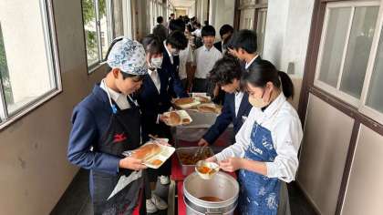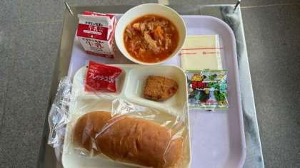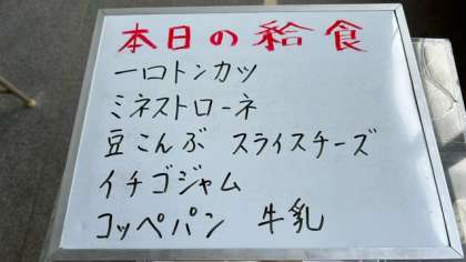 今日の給食は、ひと口とんかつ、ミネストローネ、豆昆布、スライスチーズです。パンにはいちごジャムがついています。