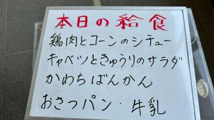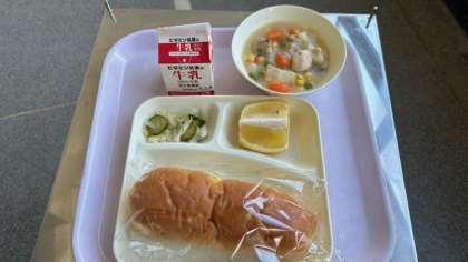 今日の給食は、鶏肉とコーンのシチュー、キャベツときゅうりのサラダ、河内晩柑(かわちばんかん)です。パンはおさつパンです。