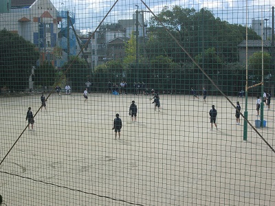水はけの良いテニスコートを使って、ソフトボールの授業が行われています。