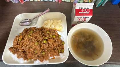 今日の給食は、タコライス、もずくのスープ、焼きじゃがです。