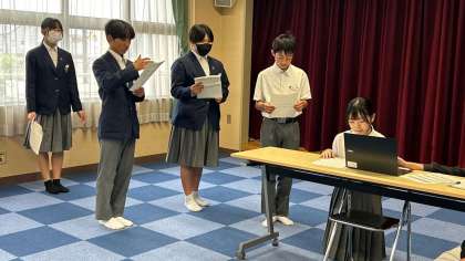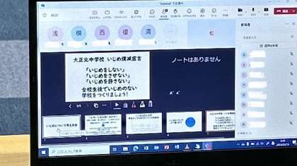 校長よりいじめについての定義を説明し、絶対に許されない事であると話をしました。その後、生徒会の皆さんよりスライドを使って、大正北中学校のいじめ撲滅を宣言しました。