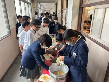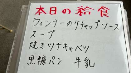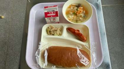 今日の給食は、ウィンナーのケチャップソース、スープ、焼き綱キャベツです。パンは黒糖パンです。