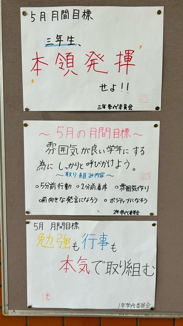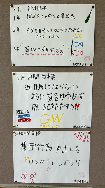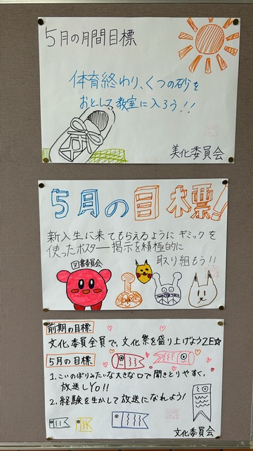 5月の各委員会より目標が示され、玄関にポスターを掲示しています。