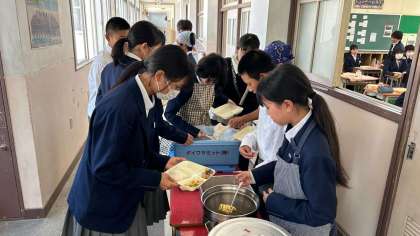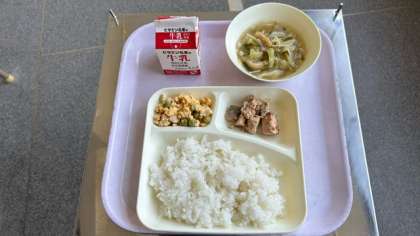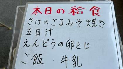 今日の給食は、鮭の胡麻味噌焼き、五目汁、えんどうの卵とじです。