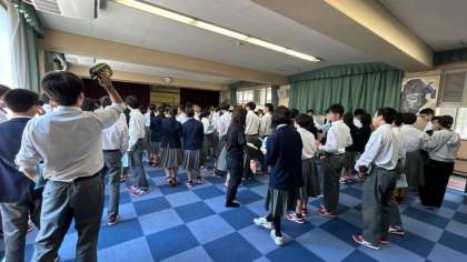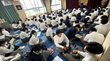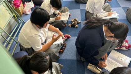 修学旅行前日の3時間目、3年生は最後の確認のため、しおりの読み合わせをしています。
