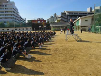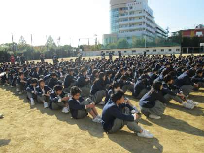 非常ベルを合図に、全校生徒が一旦グラウンドに避難しました。