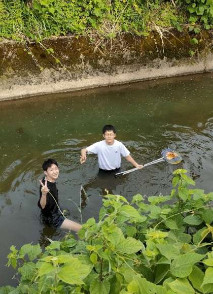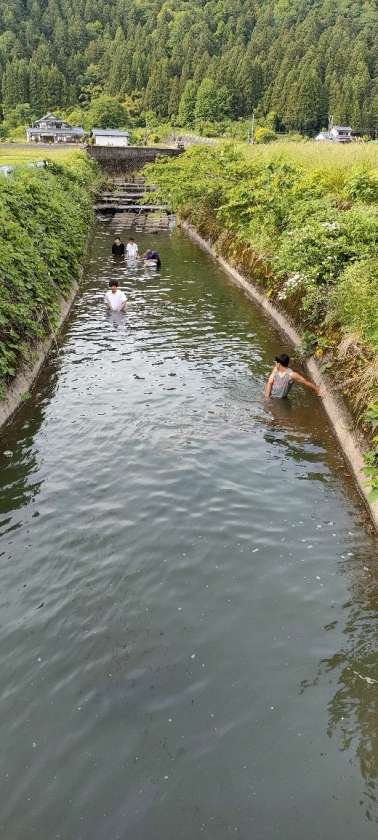 川で魚を取っている奥ぜんどんの4人を発見しました。