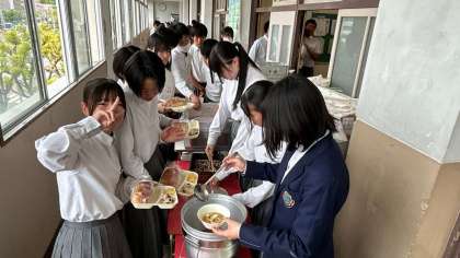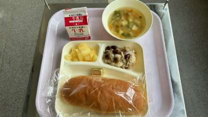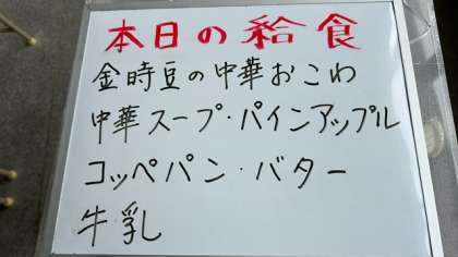 今日の給食は、金時豆の中華おこわ、中華スープ、パインアップル(カット缶)です。パンにはバターがついています。