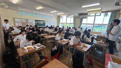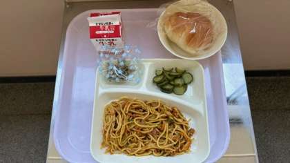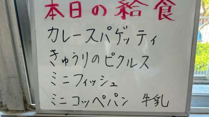 今日の給食は、カレースパゲッティー、きゅうりのピクルス、ミニフィッシュです。パンは半分の大きさのパンです。