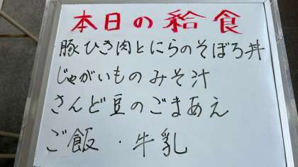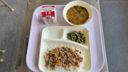 今日の給食は、豚ひき肉とにらのそぼろ丼、じゃがいもの味噌汁、三度豆の胡麻和えです。