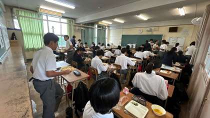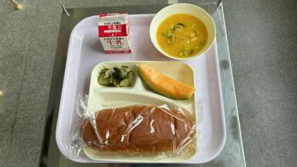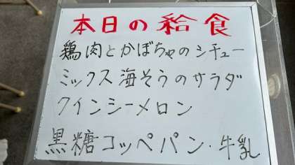 今日の給食は、鶏肉とかぼちゃのシチュー、ミックス海藻のサラダ、クインシーメロンです。パンは黒糖パンです。