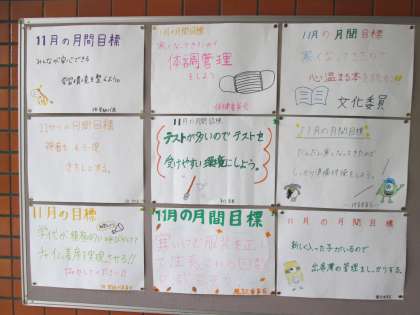 昨日の全校集会で報告された11月の目標が張り出されました。