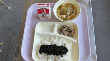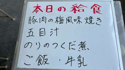 今日の給食は、豚肉の梅風味焼き、五目汁、海苔の佃煮です。