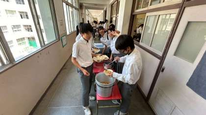 今日の給食で出ている海苔の佃煮は、小学校の給食室で作られたものです。お店では瓶に入っているものが売られていますが、じっくり時間をかけて煮詰めた佃煮です。おいしいでしょう〜!
