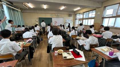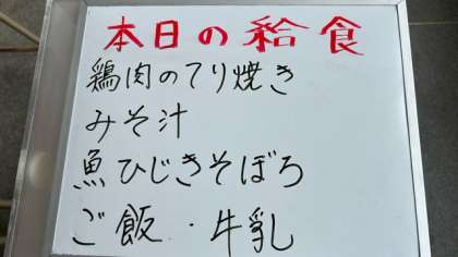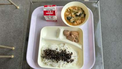 今日の給食は、鶏肉の照り焼き、味噌汁、魚ひじきそぼろです。