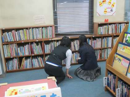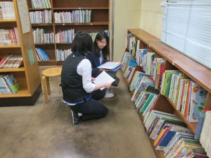 今日は休刊日でしたが、女子生徒2名が指導員さんからていねいに書物の扱いを受けています。