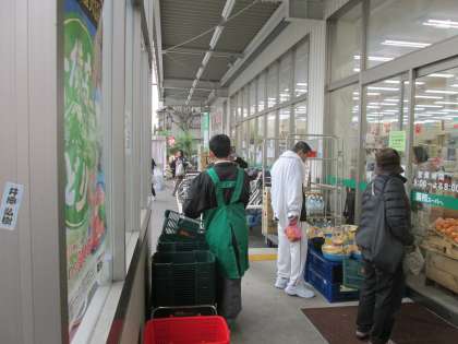 入り口でお客様にカゴを用意したりカートを整理したり、また、店内では品物の陳列を手伝っていました。