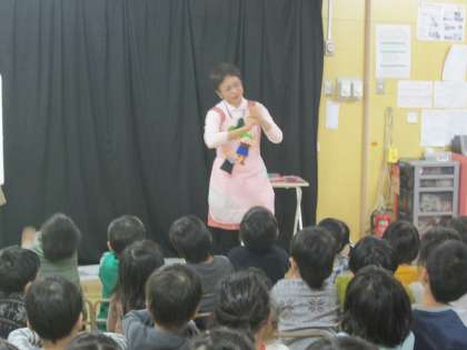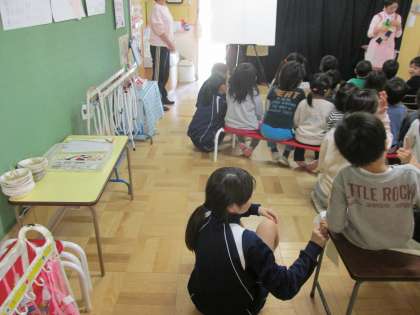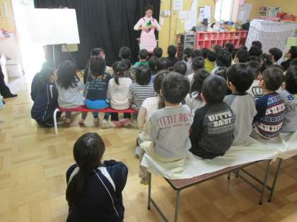 「大きなカブ」のお話。子どもたちはお行儀よく、集中して聞いています。