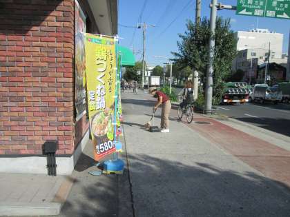 まずは、店先の清掃から。ユニフォームがとても似合っています。